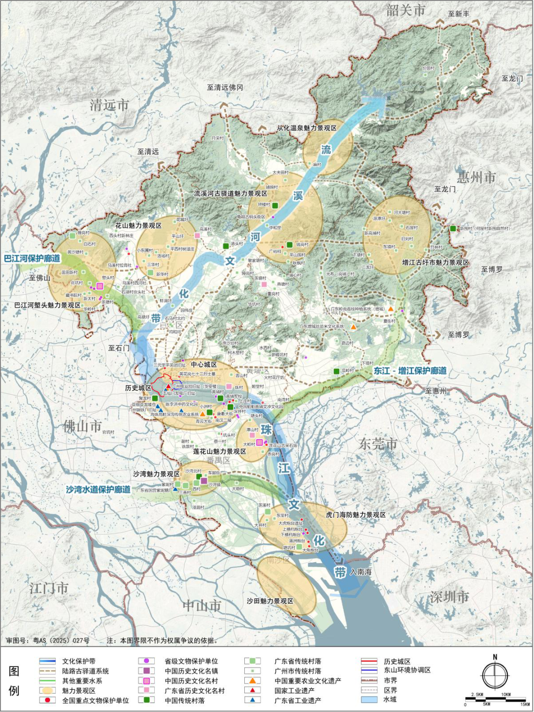 “一江一河”:依托珠江文化带和流溪河文化带,构筑市域历史文化保护传承的空间结构。