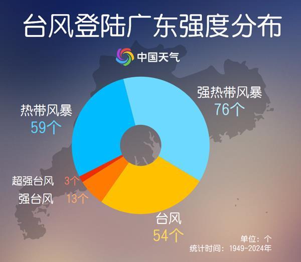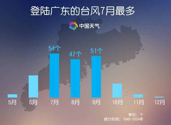 据统计1949年至2024年台风大数据发现,登陆广东的台风多为直接登陆,而且集中在夏秋季,其中7月最多,达54个。