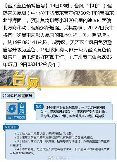 据@广州天气,19日08时41分起,广州市越秀区、 天河区台风预警信号升级为蓝色。