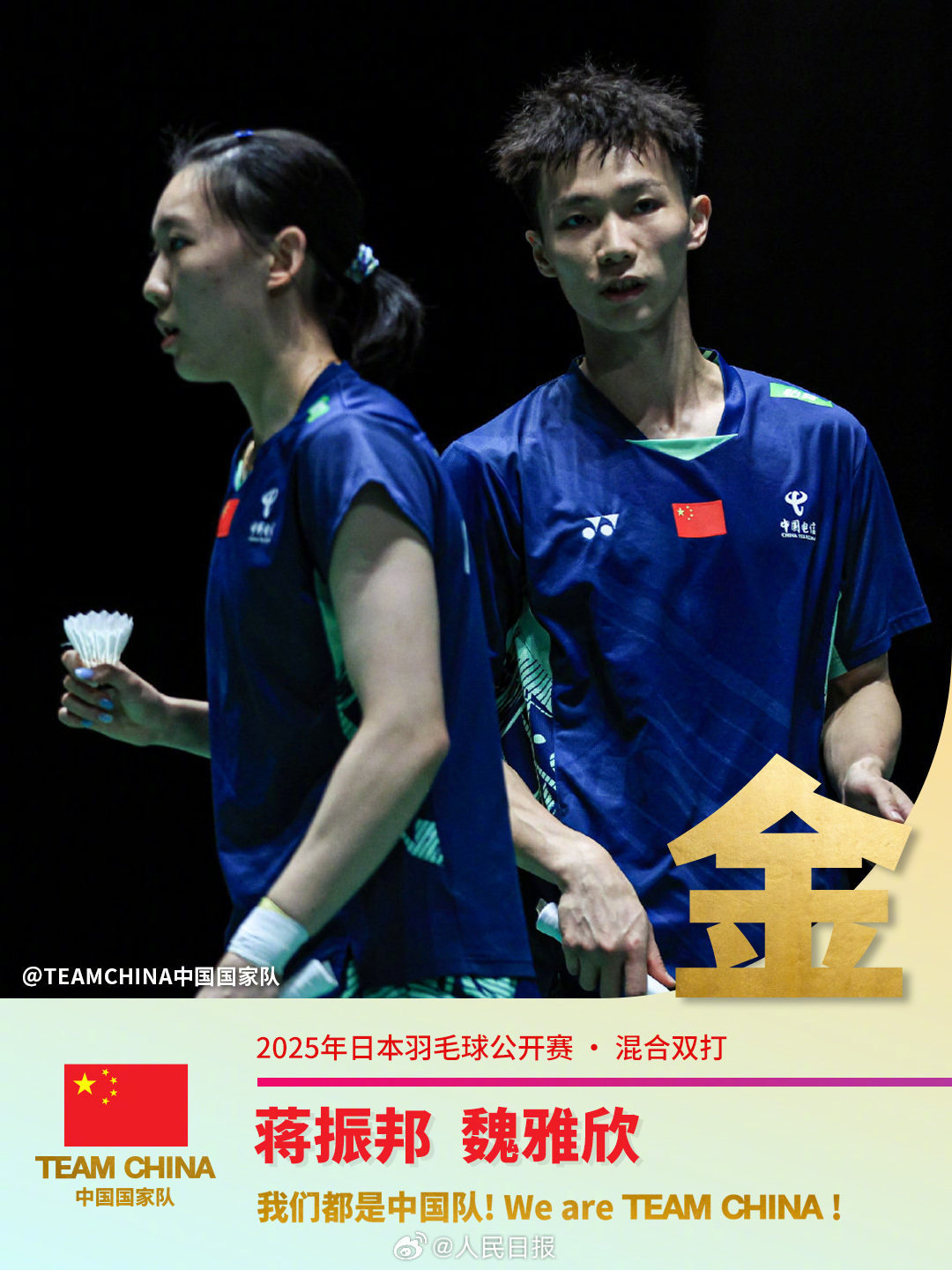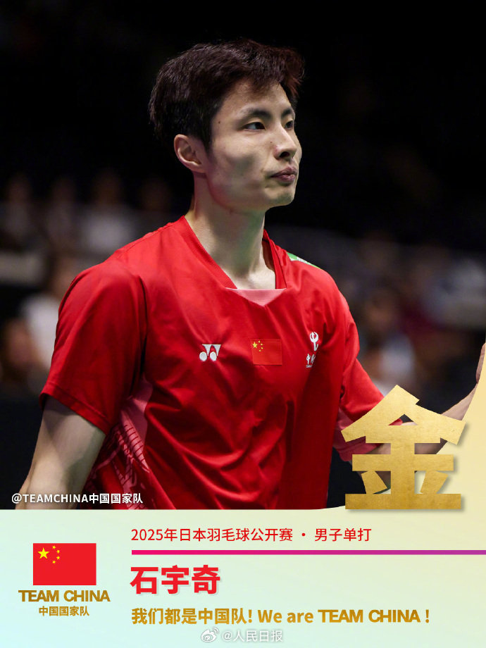 7月20日,2025世界羽联世界巡回赛日本公开赛结束所有赛程,中国队以3金1银成绩收官。蒋振邦/魏雅欣:混双冠军;刘圣书/谭宁:女双冠军;石宇奇:男单冠军;王祉怡:女单亚军。