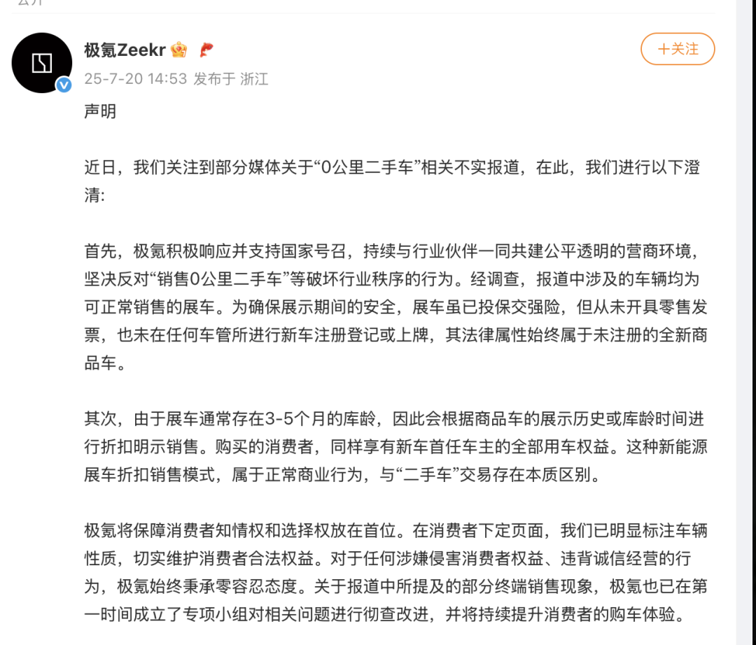 极氪表示,由于展车通常存在3-5个月的库龄,因此会根据商品车的展示历史或库龄时间进行折扣明示销售。购买的消费者,同样享有新车首任车主的全部用车权益。这种新能源展车折扣销售模式,属于正常商业行为,与“二手车”交易存在本质区别。
