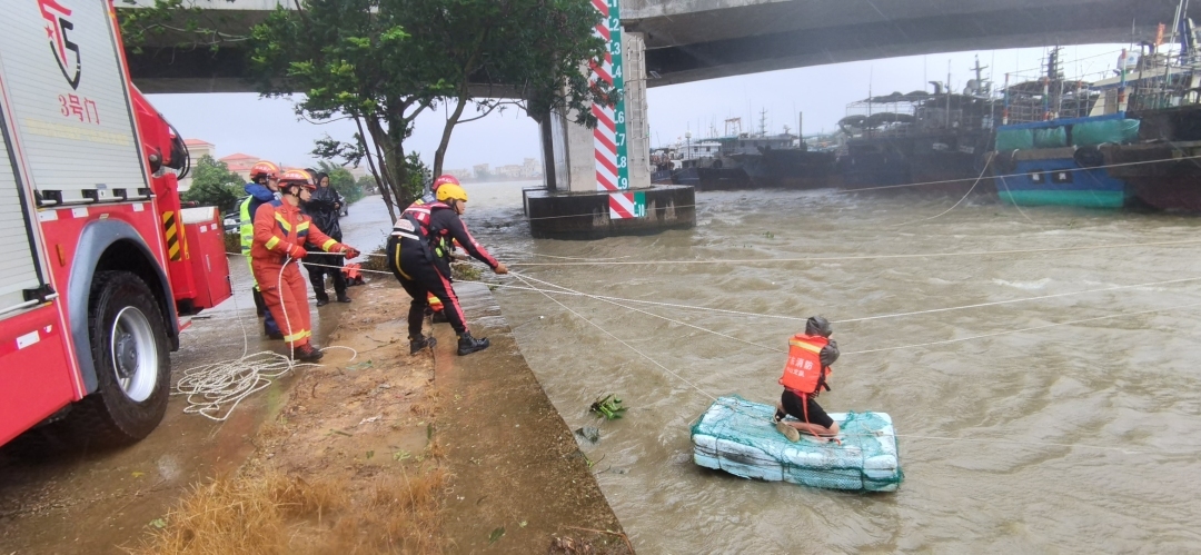 到达现场后,坦洲消防救援大队指战员利用高空横渡技术,在船与岸边搭建救援通道,对被困渔船上的被困人员进行逐个转移,最终将5名被救渔民送到安置点。