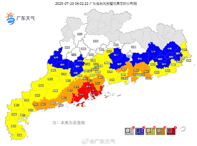 截至7月20日6时08分,广东有84个台风预警(4红16橙40黄14蓝10白)、27个暴雨预警(8橙19黄)和25个雷雨大风预警(6橙19黄)。