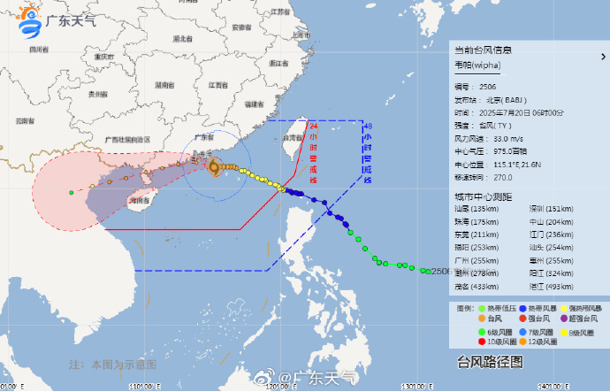 预计,未来24小时内“韦帕”将以每小时20公里左右的速度向偏西方向移动,强度逐渐增强,较大可能于今天下午到夜间以台风级或强台风级在珠海到湛江沿海地区登陆。