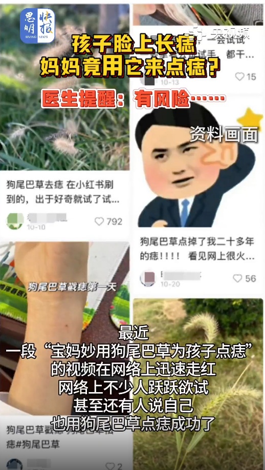 其实,这已经不是狗尾巴草第一次上热搜了。此前,一位宝妈在网络平台上晒出自己用狗尾巴草给孩子点痣的视频,引发网友热议。