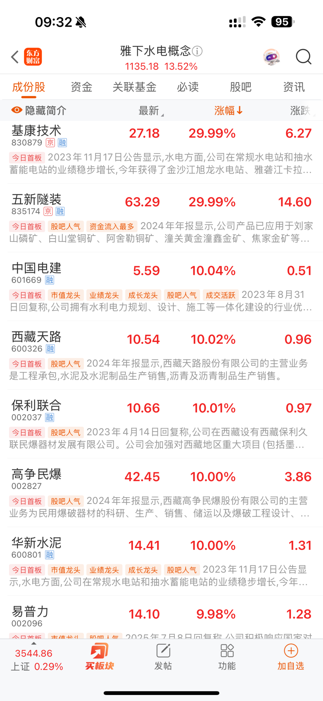 7月21日开盘,雅下水电概念股全线高开,西藏天路、保利联合、高争民爆、壶化股份多股以涨停价开盘。