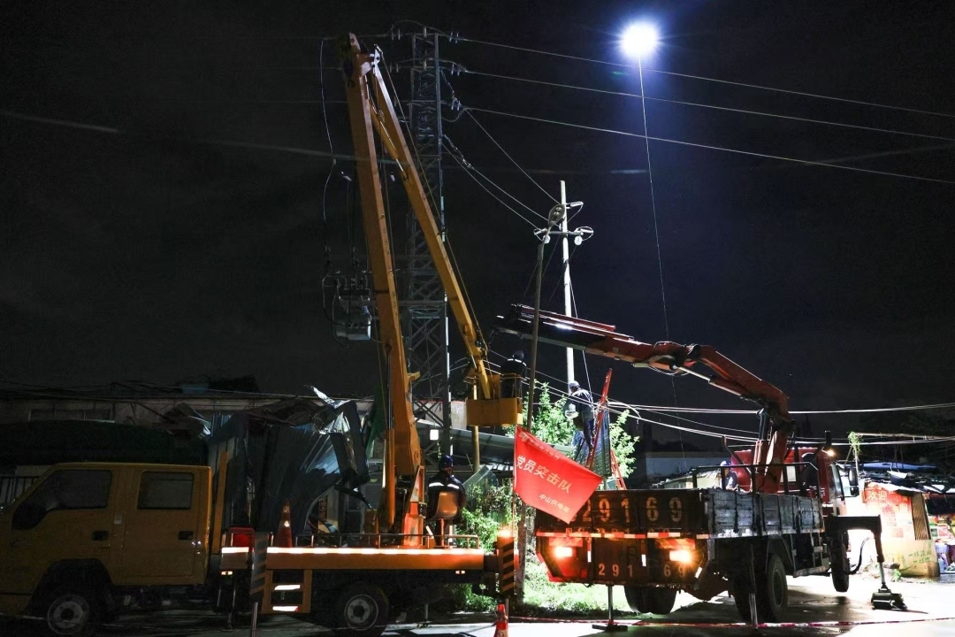 为了抢时间保鱼塘,黄伟恒果断启用带电作业,深夜雨停后,抢修人员即刻投入战斗,直至21日凌晨4点,随着公用台变成功送电,最后一个停电区域亮起灯光,中山在台风过境当夜全面恢复供电。