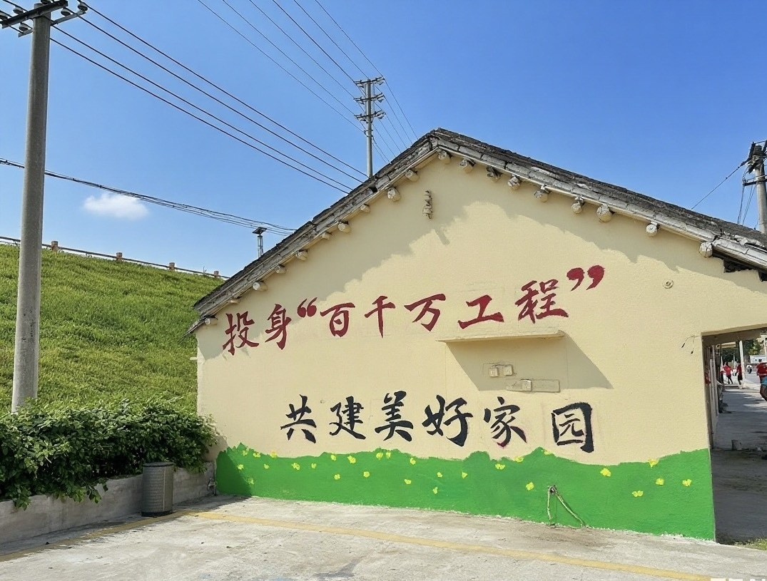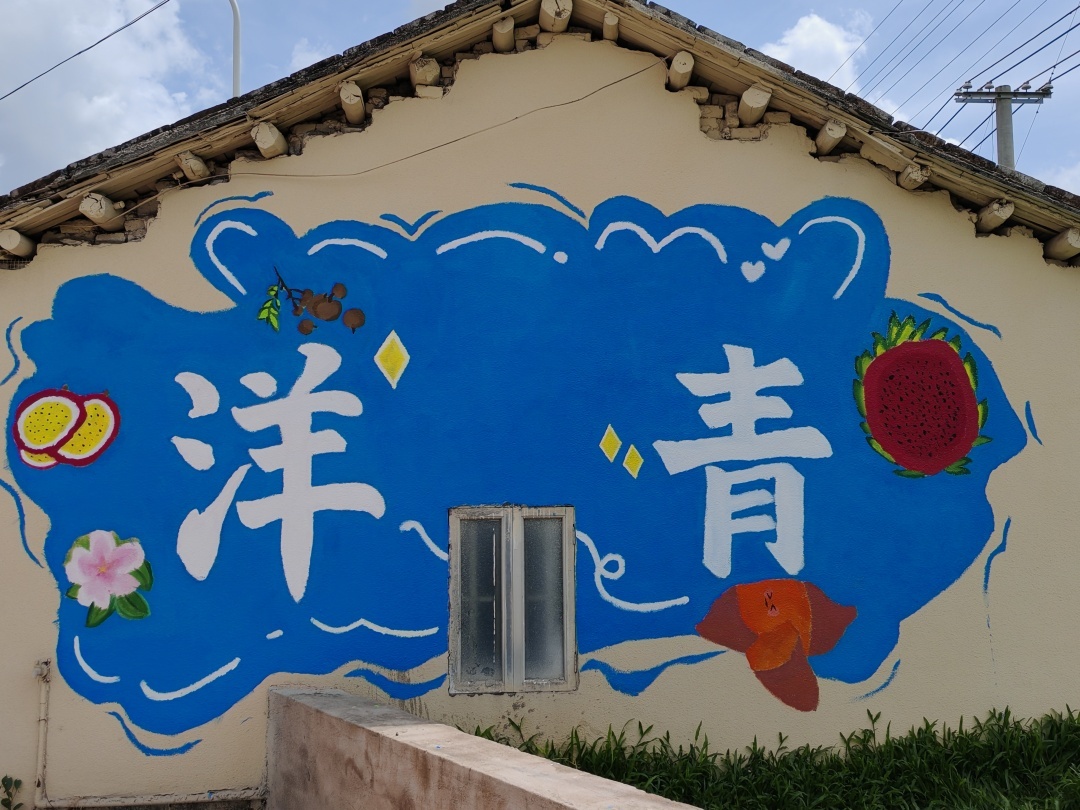 第一幅作品以“洋青”二字为主体,采用蓝色基调的饱满字体设计,周围环绕绘制了红肉火龙果、火山红薯、百香果和龙眼四大特色农产品。作品通过写实手法生动展现了农产品的形态特征,色彩明快,形象逼真。第二幅作品以“投身‘百千万工程’,建设美好家园”为主题。创作团队巧妙利用自然环境,使墙绘与周边景观相得益彰。作品采用简洁大方的设计风格,重点突出宣传标语,下方点缀花草图案,整体效果清新自然。两幅主题墙绘作品,不仅美化了村容村貌,更成为洋青镇宣传乡村振兴的生动载体。