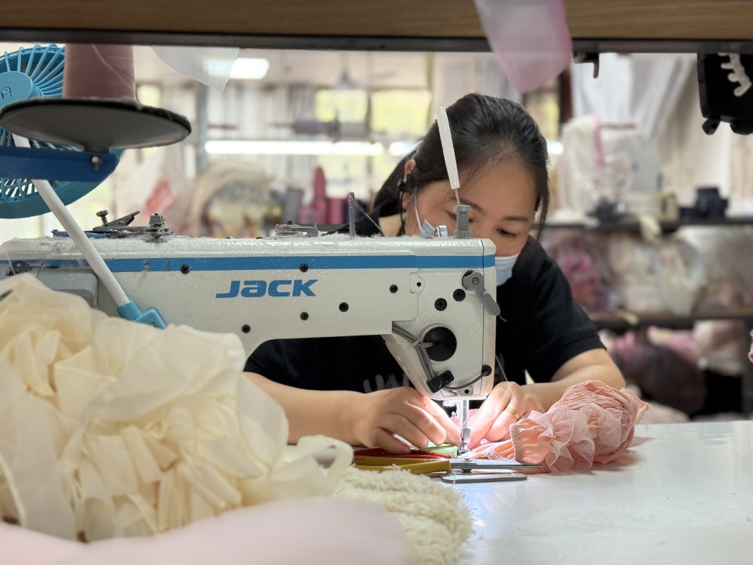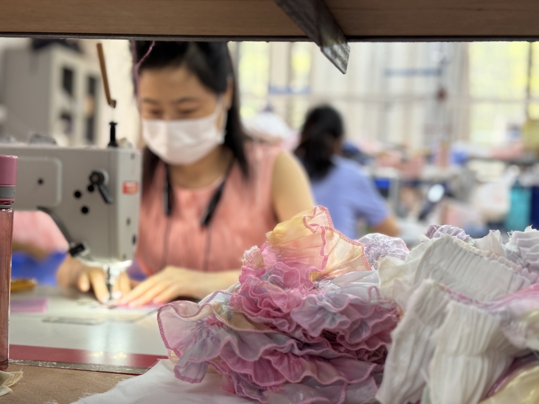区别于其他的童装,公主裙、洛丽塔裙、汉服等这类“小众”童装的工艺本来就更为复杂,谭述峰举例:近年流行的“纱纱”公主裙,从打板到最终成品制作完成,就需要20多天,这还是熟手工人的速度。“我们的裙子,要做出好的效果,同时要符合儿童穿着安全舒适的要求,裙摆的纱都是人工一层层‘叠加’上去。我们也不会用黏合面料,工序就更复杂。”入行8年,谭述峰和聂康鸣从“门外汉”,变成了童装的“行家”。“到现在,我还是坚持自己去选面料,哪些面料透气,是否合适孩子的皮肤,用手一摸便知。”谭述峰说道。