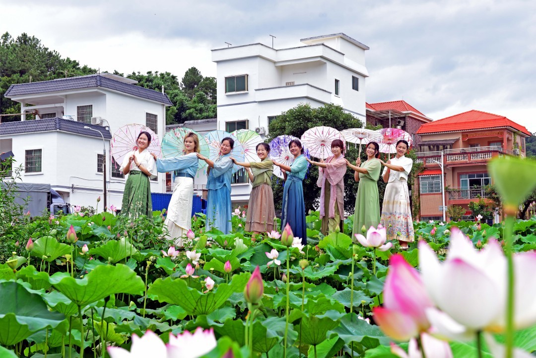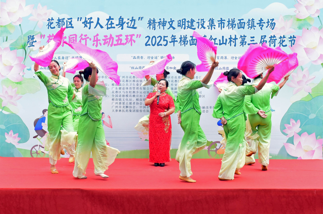花都区“好人在身边”精神文明建设集市梯面镇专场暨“荷你同行·乐动五环”2025年梯面镇红山村第三届荷花节启动仪式将活动推向又一轮高潮。花式跳绳表演、崇廉戒贪歌、爱廉说古装秀等节目精彩纷呈,展现了荷文化魅力。