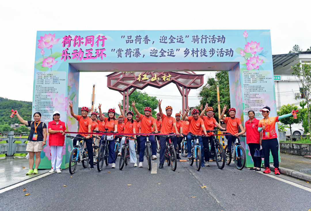 围绕“荷你同行·乐动五环”主题,一系列活动精彩纷呈。一大早,“品荷香,迎全运”骑行活动率先鸣枪,骑行者沿着五环步道,穿过美丽的荷塘、越过如画的山水,他们用车轮丈量这片美丽的土地,以绿色出行诠释健康生活。随后,“赏荷瀑,迎全运”徒步活动紧随其上,参与者沿五环步道青山环深入山林,赏飞瀑流泉、观浪漫荷田,尽享自然野趣与运动活力。