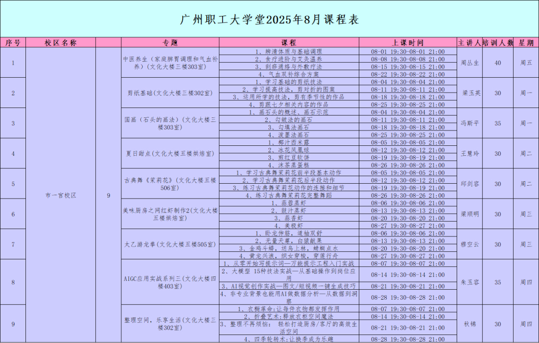 广州职工大学堂8月课程安排显示,316节免费课程将在8个直属校区开课,包括《AIGC应用实战系列三》《西式料理》《纸藤编制作》《气排球进阶班》《豆包AI从入门到进阶》《无人机与摄影》《创意手工——非遗掐丝螺钿制作》《立体刺绣》《传统中式甜点》《爵士舞》等79个专题,其中部分课程为实操课。