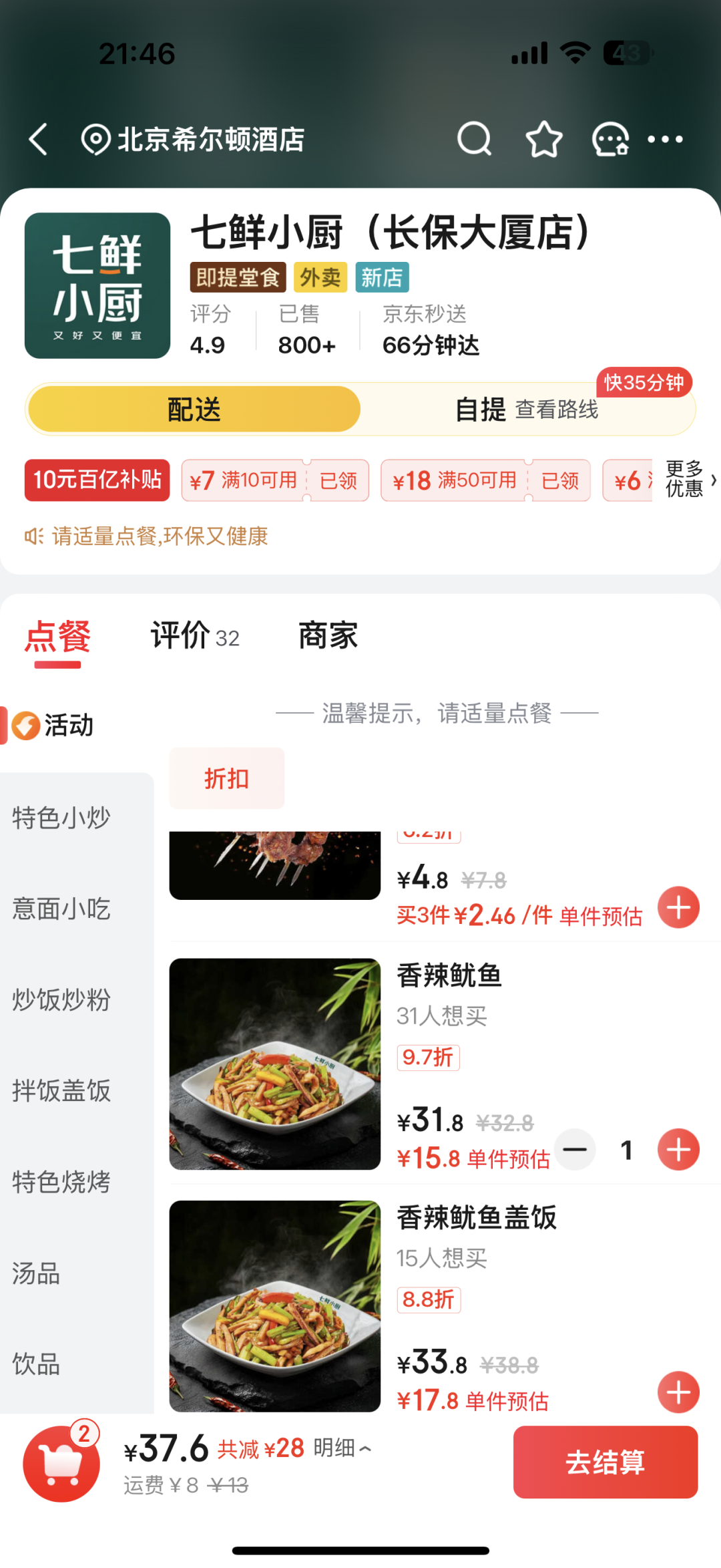 记者通过京东外卖页面输入“七鲜小厨”搜索,根据店铺的页面显示“即提堂食”“外卖”“新店”,地址位于北京长保大厦,已售800+,评分4.9。记者留意到,该店的餐品类型包括特色小炒、意面小吃、炒饭炒粉、拌饭盖饭、特色烧烤、汤品、饮品等,价格方面,例如一份小炒牛肉盖饭售价为33.8元,当前优惠后是17.8元,一份酸辣土豆丝售价是19.8元,当前折扣之后是5.8元,一份牛肉炒饭售价是26.8元,当前优惠是16.8元。页面显示,目前店内活动减5元运费。其间,记者输入的配送地址定位在北京朝阳区某地,假如是定位广州,暂时无法搜索到“七鲜小厨”。