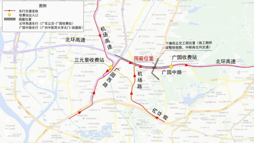 【注意绕行!7月26日夜间广园路下塘西路立交将围蔽施工】广州市中心区交通项目管理中心计划于7月26日23:00~7月27日早7:00开展跨北环高速主梁南跨围蔽施工,期间需临时封闭北环高速(广花出口至广园路入口路段)东行方向主线、封闭北环高速东行广花收费站出口和广园中路(广州中医药大学北门至政通路路口路段)东行方向交通。查看详情>>
