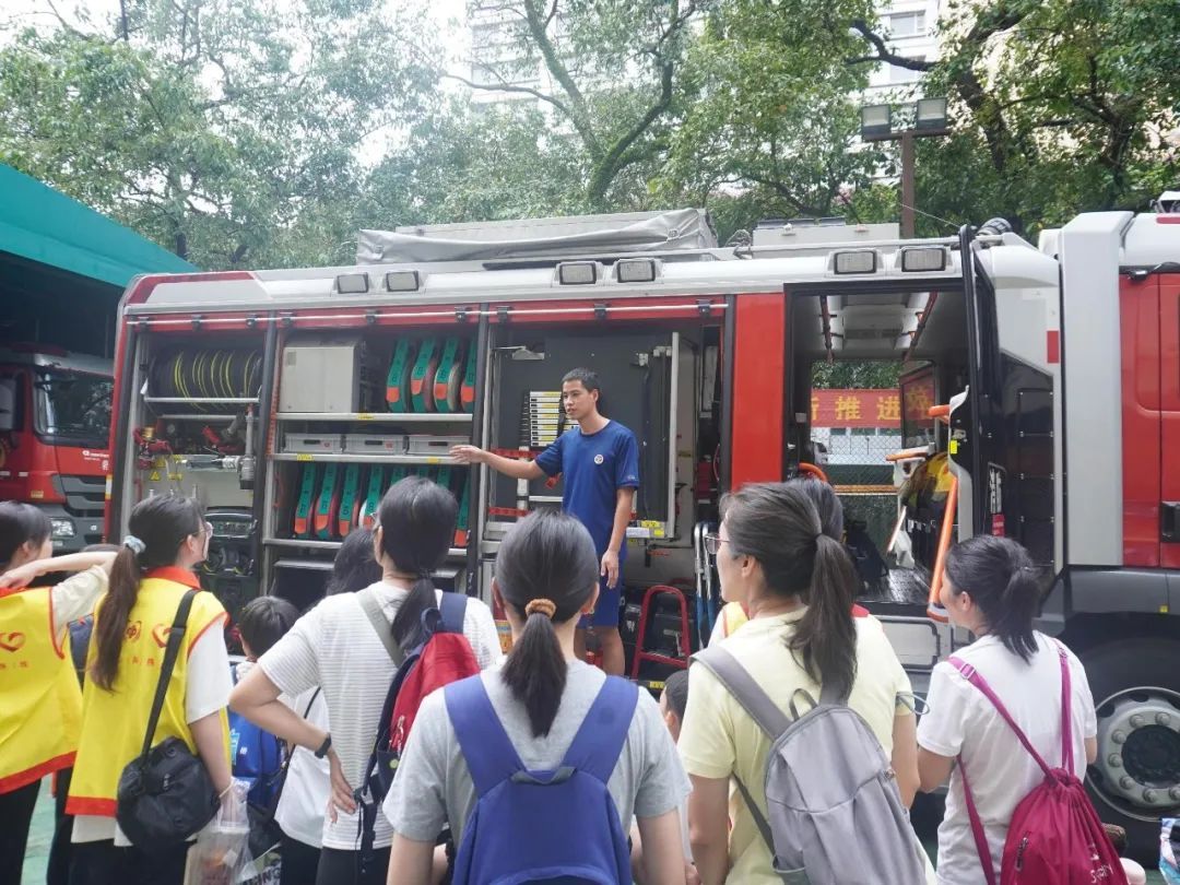 在消防站内,轰鸣的引擎与锃亮的装备瞬间抓住了孩子们的目光。消防员化身为“安全导师”,细致讲解消防车的功能与破拆、急救等专业器材的用途。