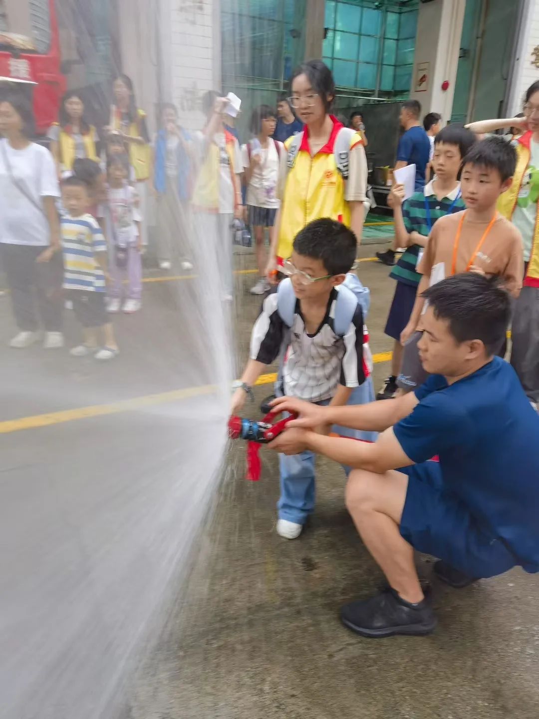 在“防火课”上,消防员用通俗的语言传授安全用电、火场逃生与报警诀窍,孩子们踊跃提问,学习氛围浓厚。随后孩子们变身“小小消防员”,在专业保护下轮流穿戴厚重的消防服、体验水枪喷射。