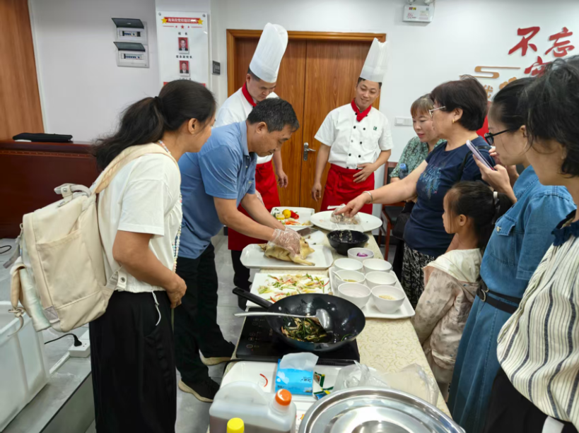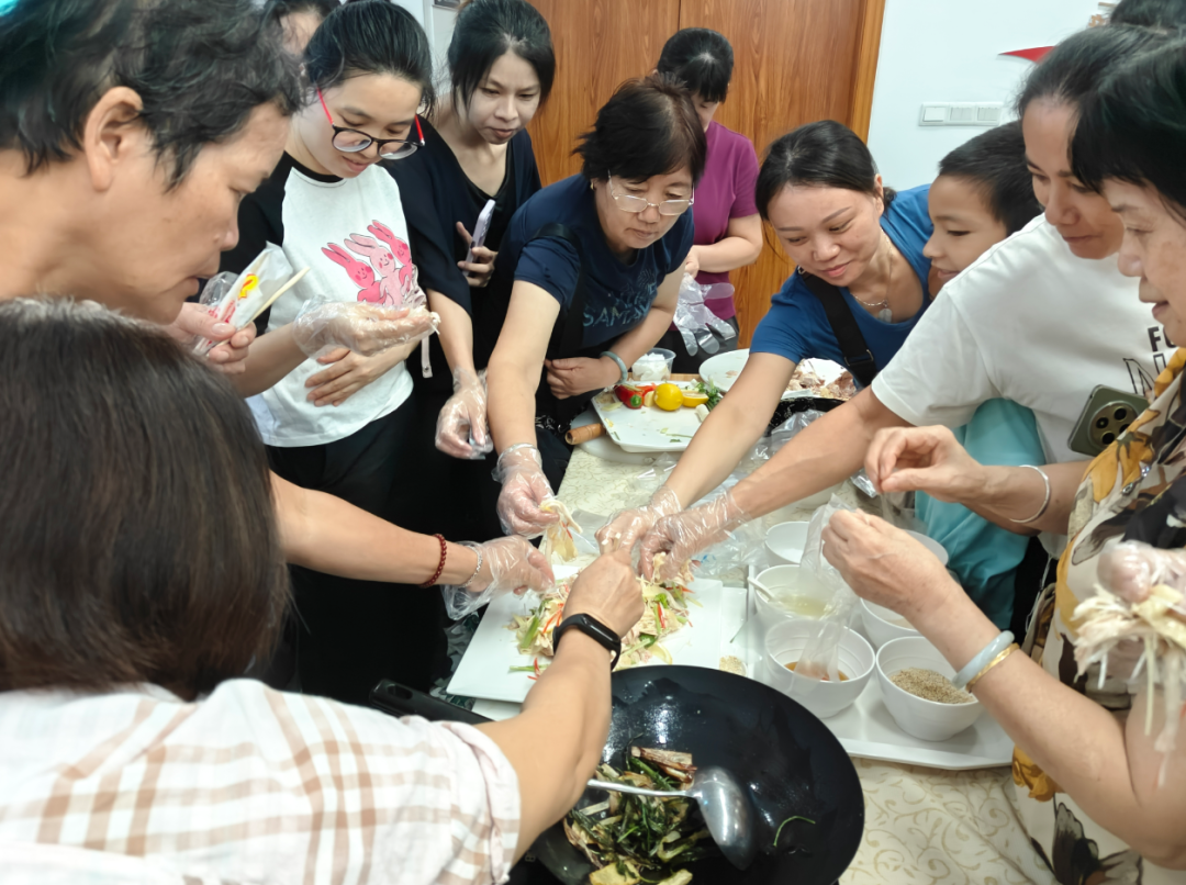 理论讲解后,讲师现场处理熟鸡示范调味,并邀请居民品尝。成品色泽诱人、香气扑鼻,居民纷纷称赞“色香味俱全”。随后的实践环节,居民们踊跃上手,在讲师指导下尝试制作。