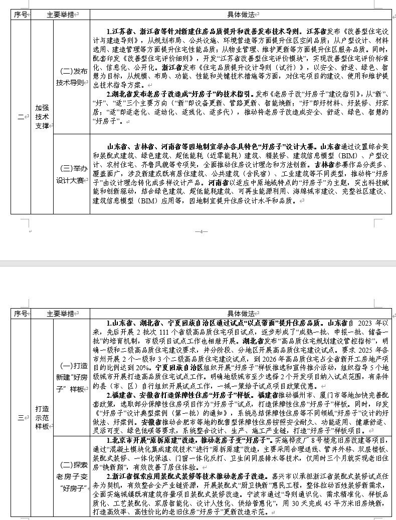 此外,一些地方从加强过程监管、强化部门协同和完善支持措施等方面推动好房子政策出台。在加强技术支撑上,一些地方提高了建设标准,发布了技术导则,举办了设计大赛。在打造示范样板上,清单中既有打造新建“好房子”样板的做法,也有探索老房子变“好房子”的实践。