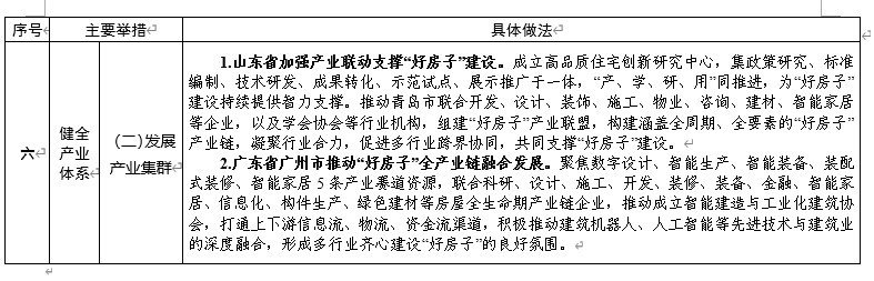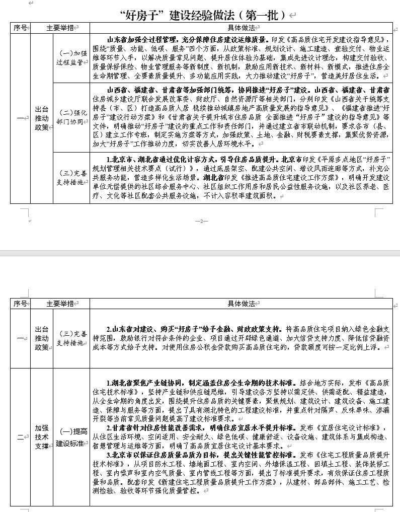 近日,住房和城乡建设部印发《“好房子”建设经验做法(第一批)》,总结了各地“好房子”建设经验做法,以加大“好房子”工作推动力度。可以看到,首批“好房子”经验做法涵盖出台推动政策、加强技术支撑、打造示范样板、强化科技赋能、优化物业服务和健全产业体系等六个方面。