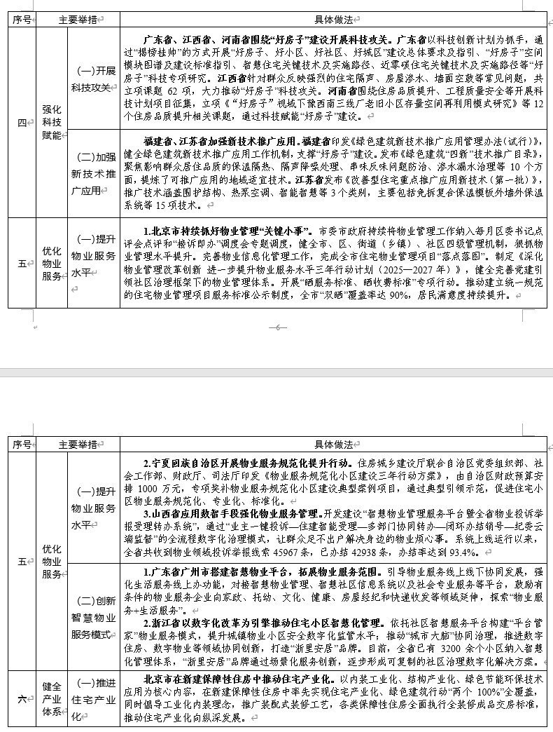 根据经验清单,在强化科技赋能方面,广东省以科技创新计划为抓手,通过“揭榜挂帅”的方式开展“好房子、好小区、好社区、好城区”建设总体要求及指引、“好房子”空间模块图谱及建设标准指引、智慧住宅关键技术及实施路径、近零碳住宅关键技术及实施路径等“好房子”科技专项研究。在优化物业服务方面,广州市创新智慧物业服务模式、健全产业体系,发展产业集群的做法成为值得参考学习的经验。包括搭建智慧物业平台,拓展物业服务范围。引导物业服务线上线下协同发展,强化生活服务线上办功能,对接智慧物业管理、智慧社区信息系统以及社会专业服务等平台,鼓励有条件的物业服务企业向家政、托幼、文化、健康、房屋经纪和快递收发等领域延伸,探索“物业服务+生活服务”。