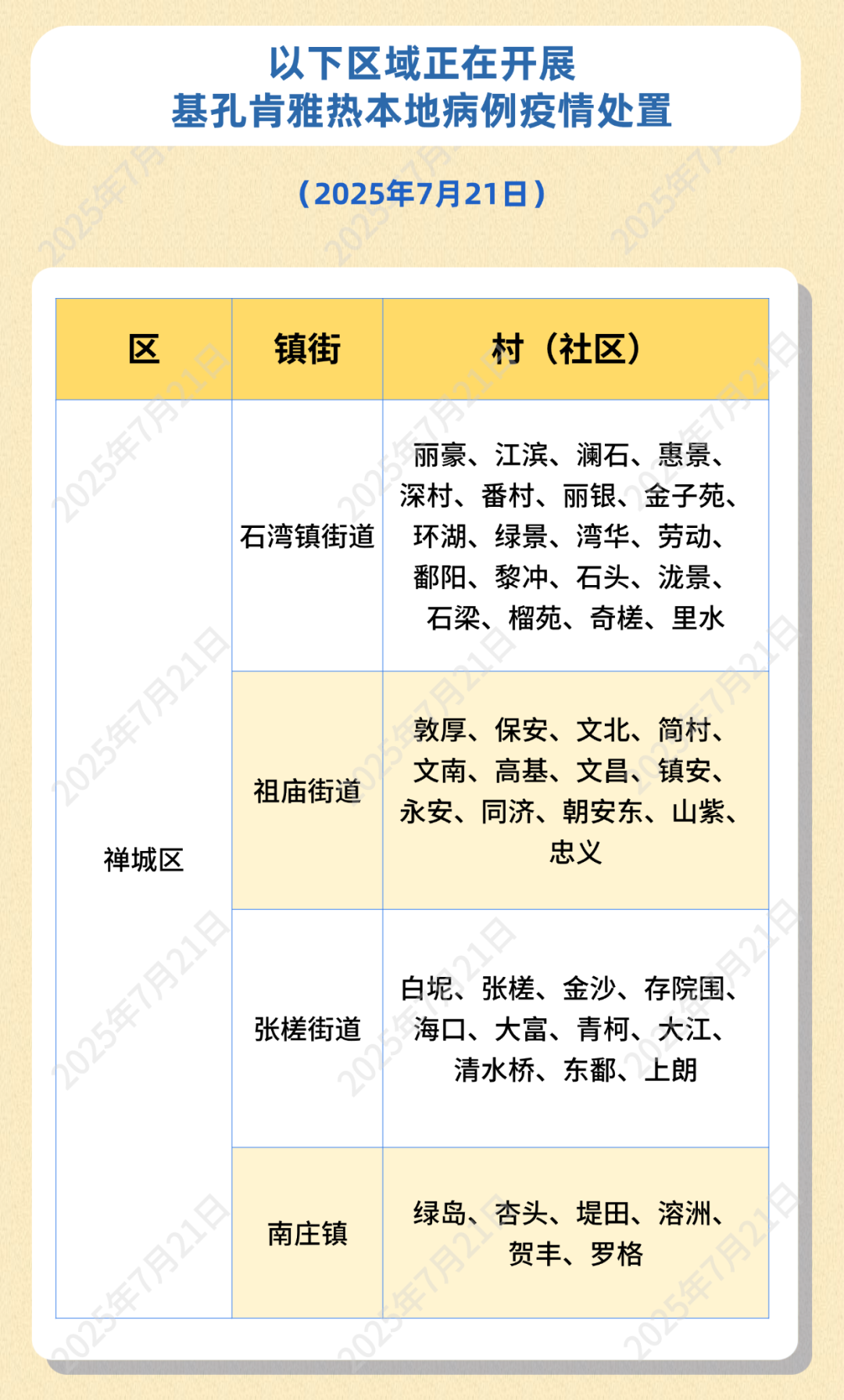 另外,禅城区疾控中心公布正在开展基孔肯雅热疫情处置的区域,请市民朋友们做好防范。详情见下表。