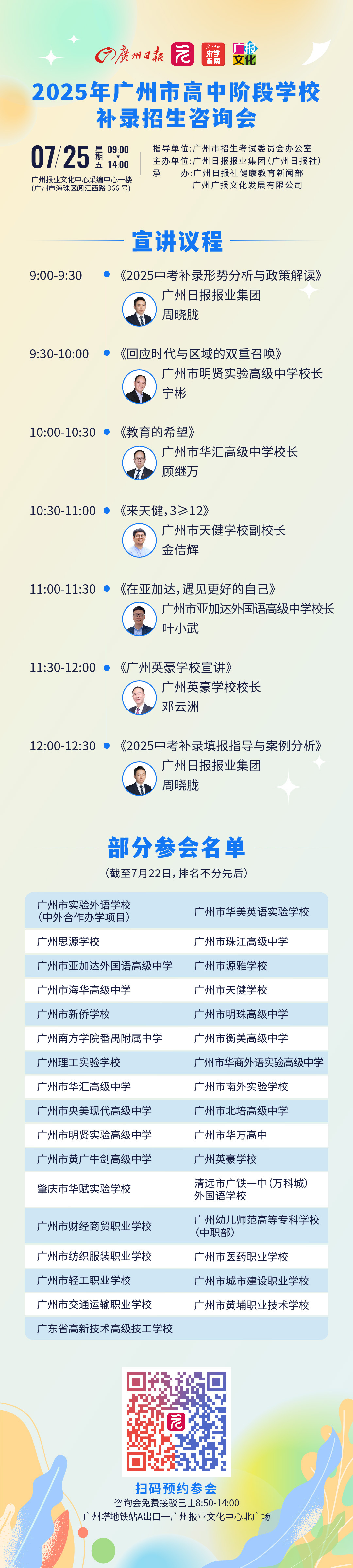 7月25日,来广州报业文化中心,参加2025年广州市高中阶段学校补录招生咨询会,只需半天时间,一次性、一站式解决与补录相关的问题和疑惑。