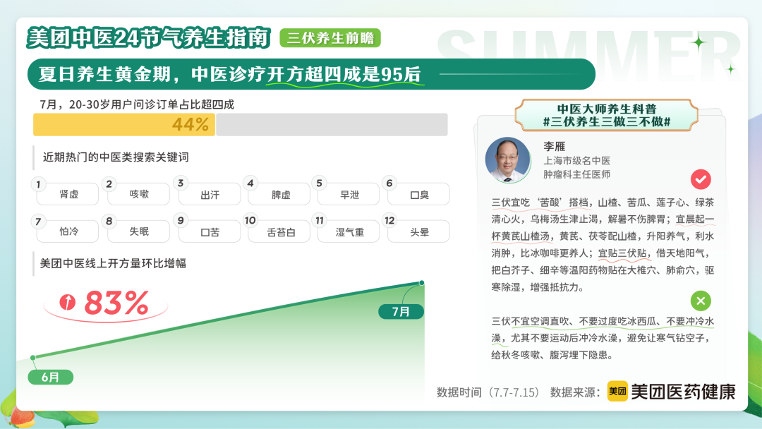 连日来,全国多地气温持续攀升,越来越多年轻人主动加入了中医养生局。美团医药健康发布的《美团中医24节气养生指南-三伏养生前瞻》数据报告显示,近期,美团中医问诊开方量环比增长超80%。其中20岁至30岁的95后用户占比达44%。从用户搜索的高频词来看,冬病夏治、祛暑祛湿、两性健康、痛症调理等成为关注度最高中医养生方向。