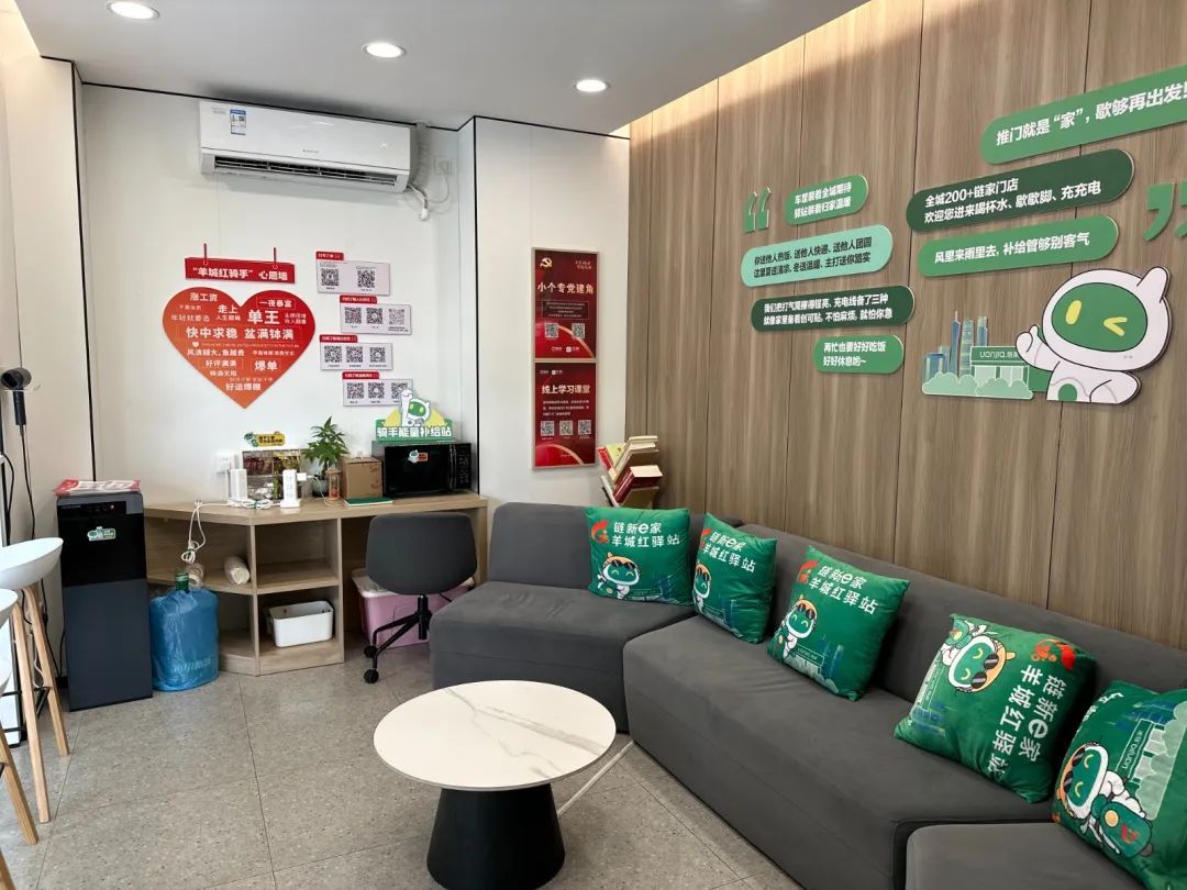 近日,记者来到广州链家雅湖居的链“新”e家·羊城红驿站(贝壳骑手驿站),在近20平方米的空间,沙发、书柜、微波炉、饮水机、充电宝等设施一应俱全,同时还配备了药品、雨具、轮胎充气泵等应急物资。