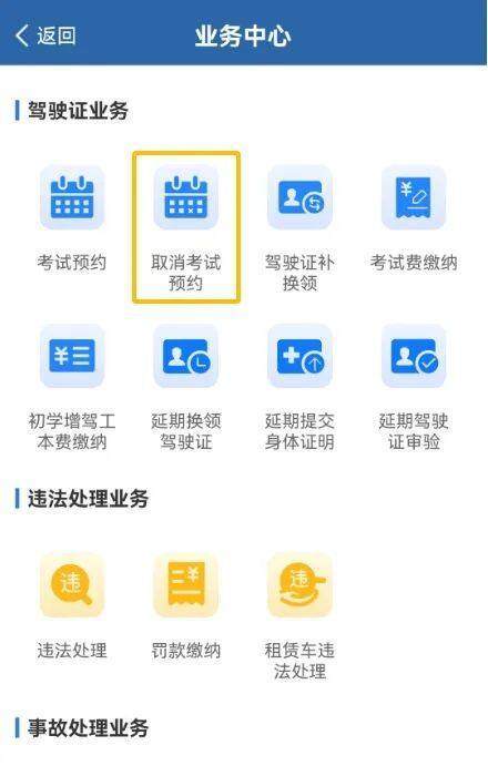 未出考试预约结果前取消的,在考试预约日期截止前,网办进度显示“受理中”,因故需取消预约的,按照以下流程自主取消:“交管12123”APP→更多→业务中心→驾驶证业务→取消考试预约。