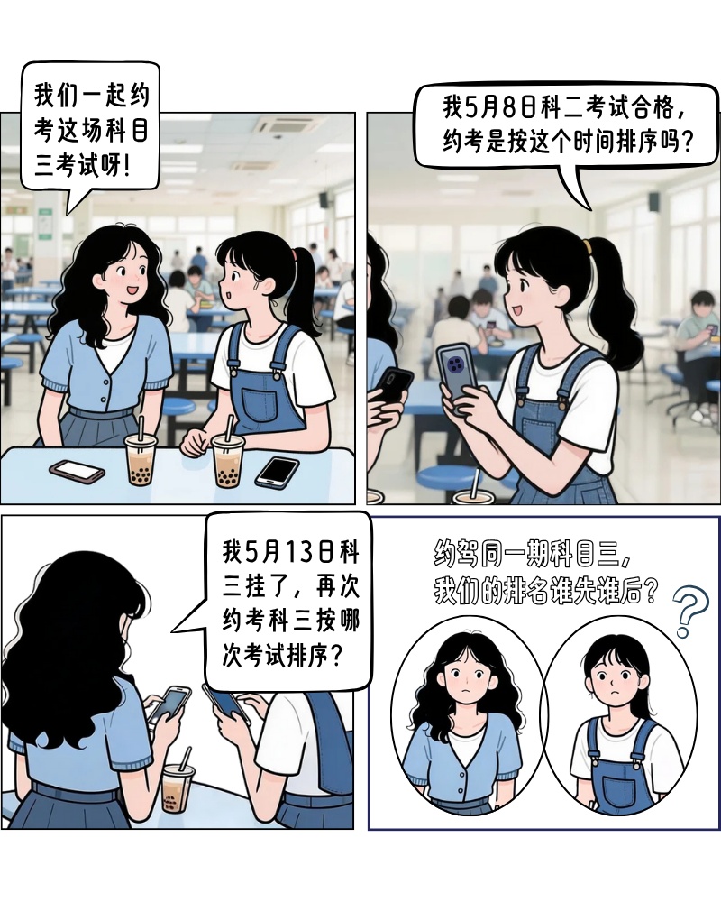 该女生初次约考科三,按5月8日的科二考试合格时间排序;如果二人预约同一场考试,其排名先于另一女生。