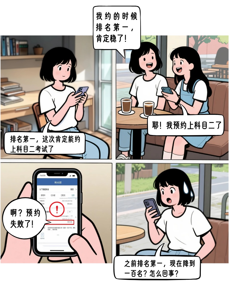 场景中,女生提交预约申请时,系统显示的是其在已提交预约申请学员当中的排名情况,但随着更多学员提交预约申请,排名会发生变化。受理时间早或间隔时间长的其他学员提交预约申请,最终女生的排名降到了100名——超出该场次考试计划数,因此预约失败。