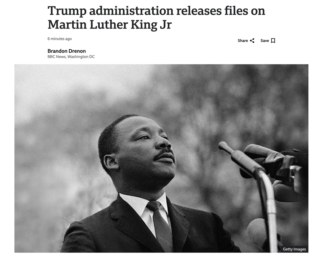 马丁·路德·金的影响早已超越个人,他所承受的制度压迫也映射出美国政府在关键历史节点如何对待反对者与改革者。特朗普政府此时推动档案公开,既可能成为推动制度透明的契机,也有可能引发关于“如何讲述国家记忆”的新一轮文化争夺。