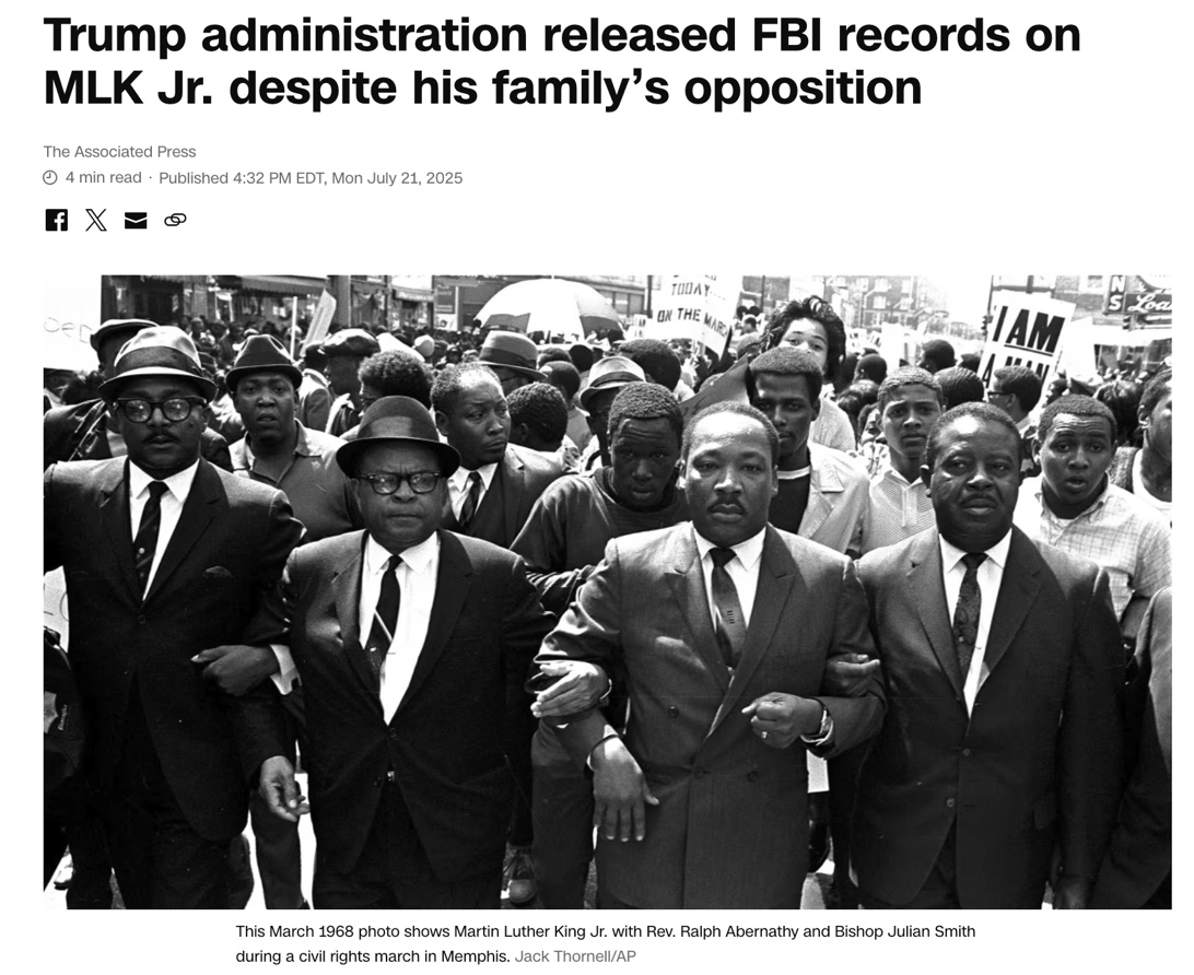 △BBC报道,马丁·路德·金的多数家人指责特朗普政府公布档案,表示这些文件的发布,必须放在完整历史背景中来看待