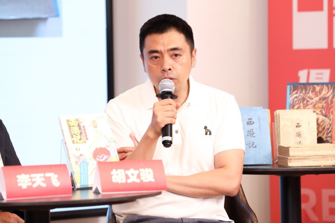 本次活动开启了嘉宾对谈环节。人民文学出版社古典编辑部主任胡文骏老师介绍了“四大名著”概念的由来及其与人民文学出版社的深厚渊源。胡文骏特别指出,本次新书《不白吃漫话西游记》实现了从“文字为主、插图为辅”到“以图像(漫画)为主角”的质的飞跃,是《西游记》出版形式的重要创新。