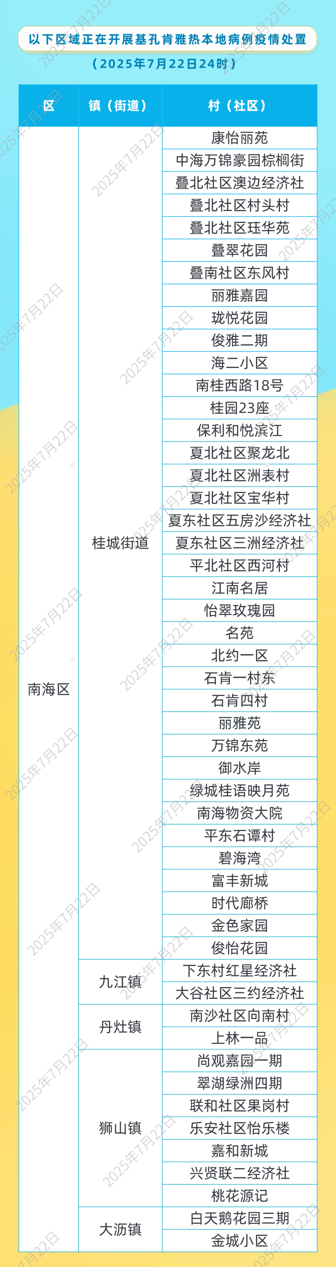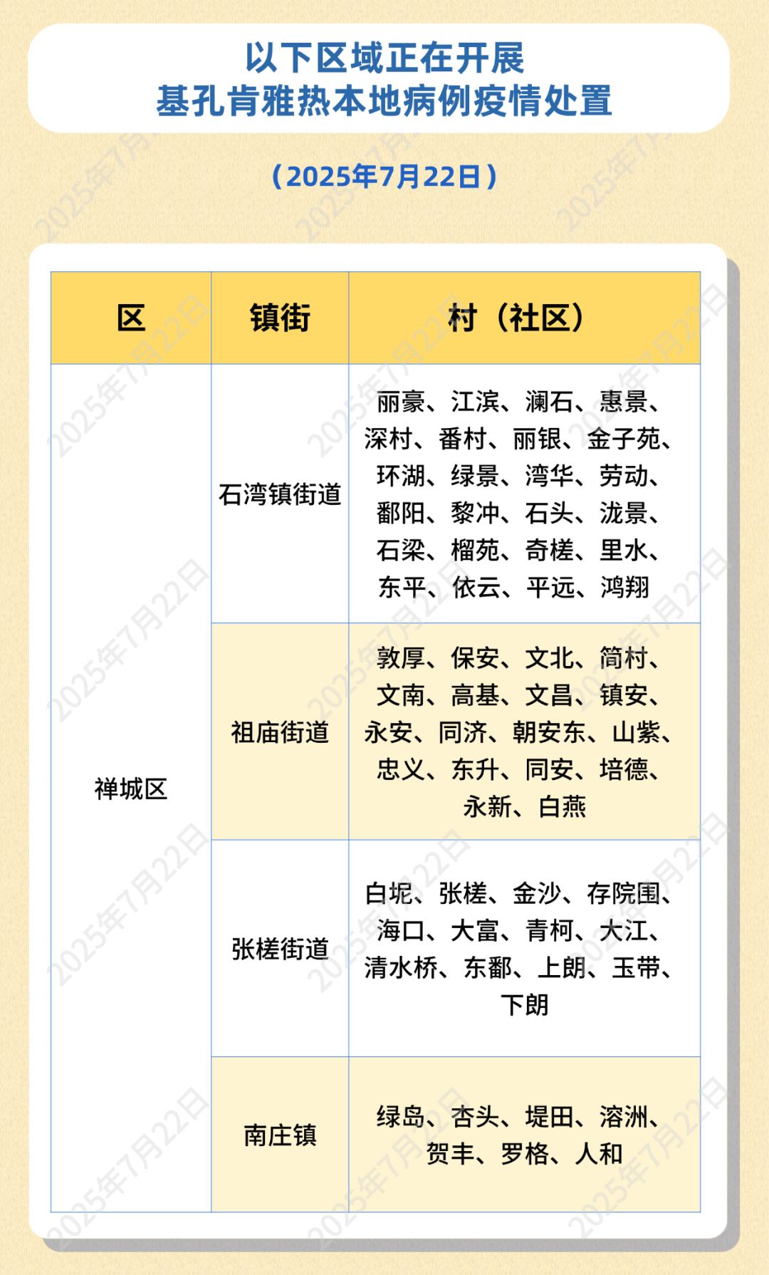 禅城、南海区疾控中心分别公布正在开展基孔肯雅热疫情处置的区域,请市民朋友们做好防范。详情见下表。