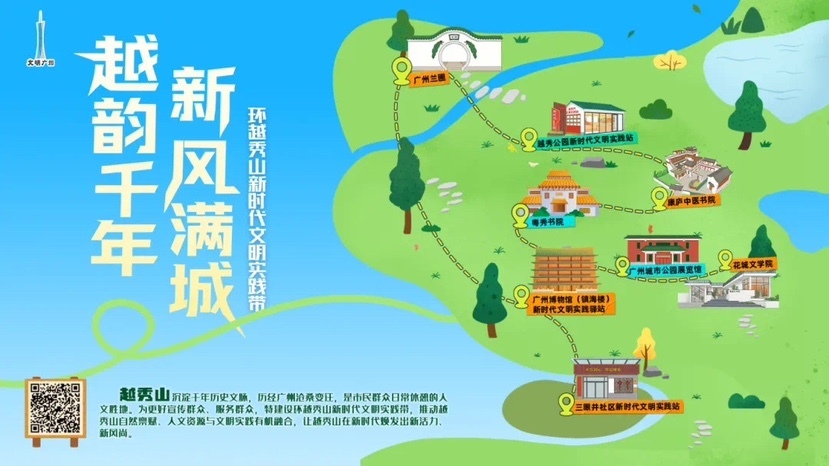 作为活动核心环节,“越韵千年 新风满城”环越秀山新时代文明实践带(以下简称文明实践带)正式发布,标志着广州新时代文明实践阵地建设迈入“串珠成链”的新阶段。文明实践带串联起八大特色文明实践阵地,构建起集教育、文化、休闲、体验于一体的文明风景线,实现文明实践阵地由“点”到“带”的能级跃升。