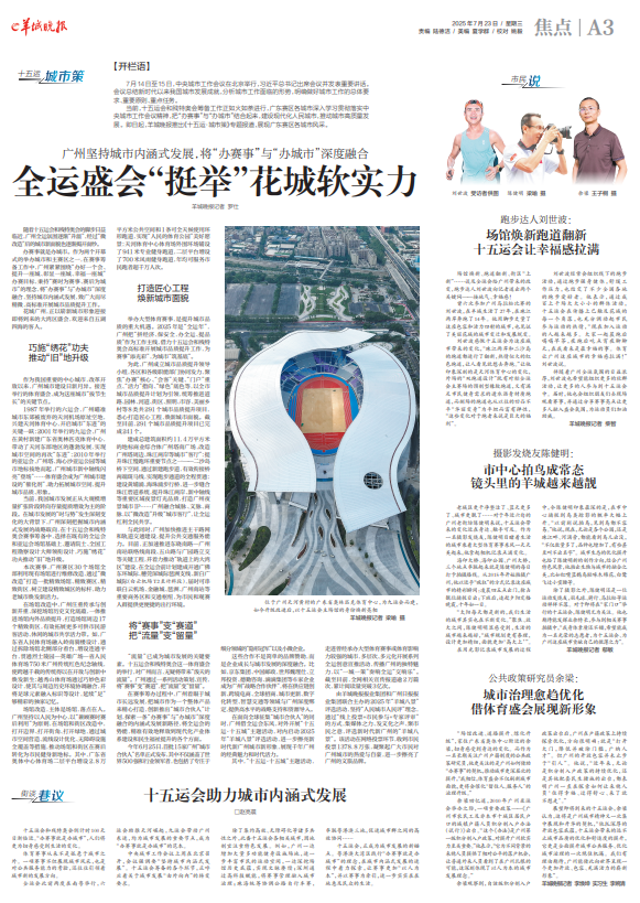 “场馆改造、道路提升、绿化升级”,家住广东省奥体中心附近的余梁,切身感受到身边的变化。而作为一名长期关注广州户籍制度的公共政策研究员,他更关注的是广州如何借助“办赛事”的契机,推动城市更深层次的提升,“我相信,体育盛会不仅刷新城市面貌,更将会催化‘留住人、服务人’的治理升级。”