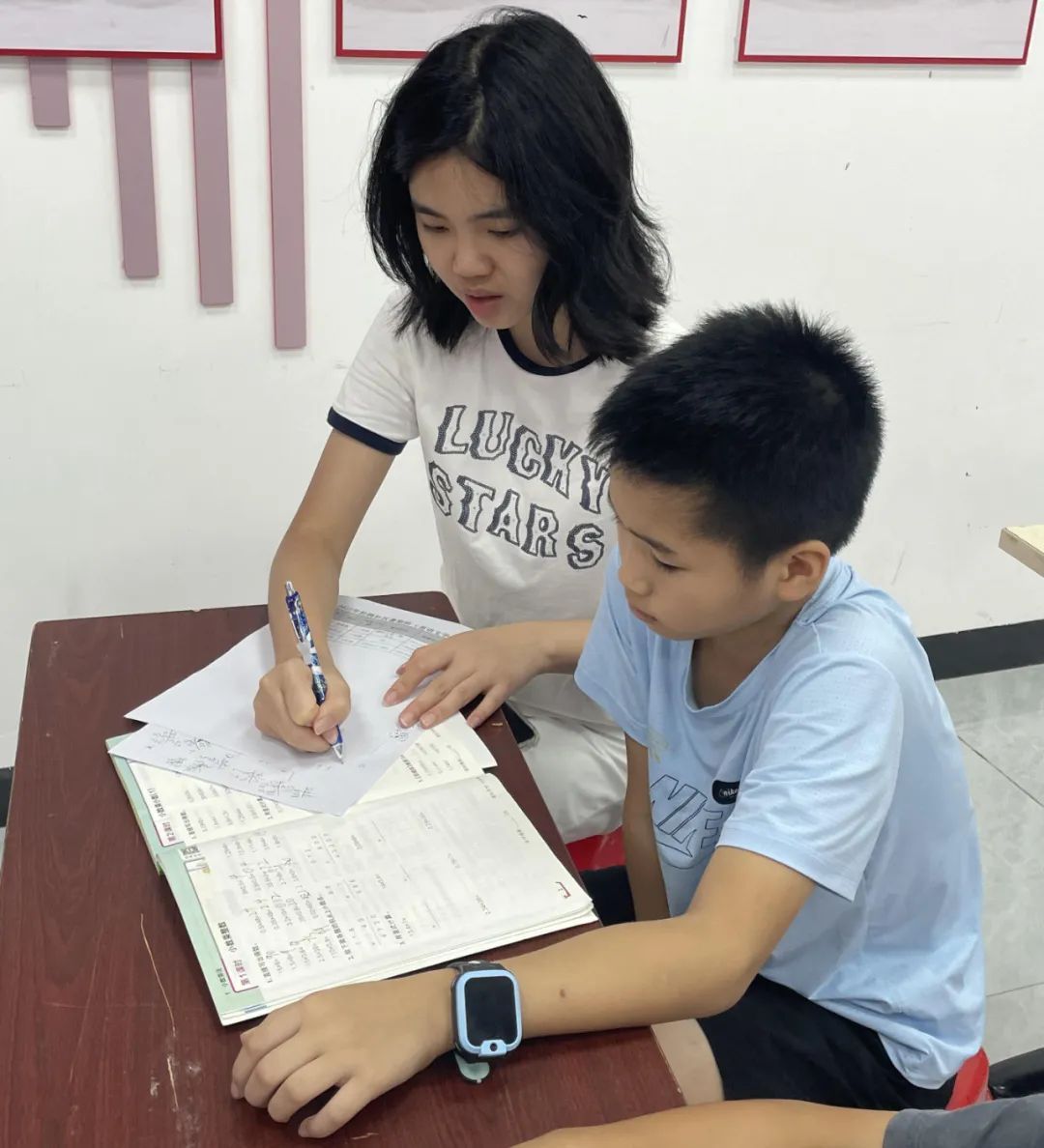 数学思维训练课上,志愿者老师因材施教,讲解由浅入深,通过具体案例拆解抽象知识点,从规范书写符号到构建解题模型,耐心细致地进行讲解。