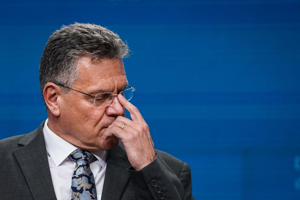 7月14日,在比利时首都布鲁塞尔,欧盟委员会负责贸易和经济安全等事务的委员谢夫乔维奇出席新闻发布会。新华社记者彭子洋摄