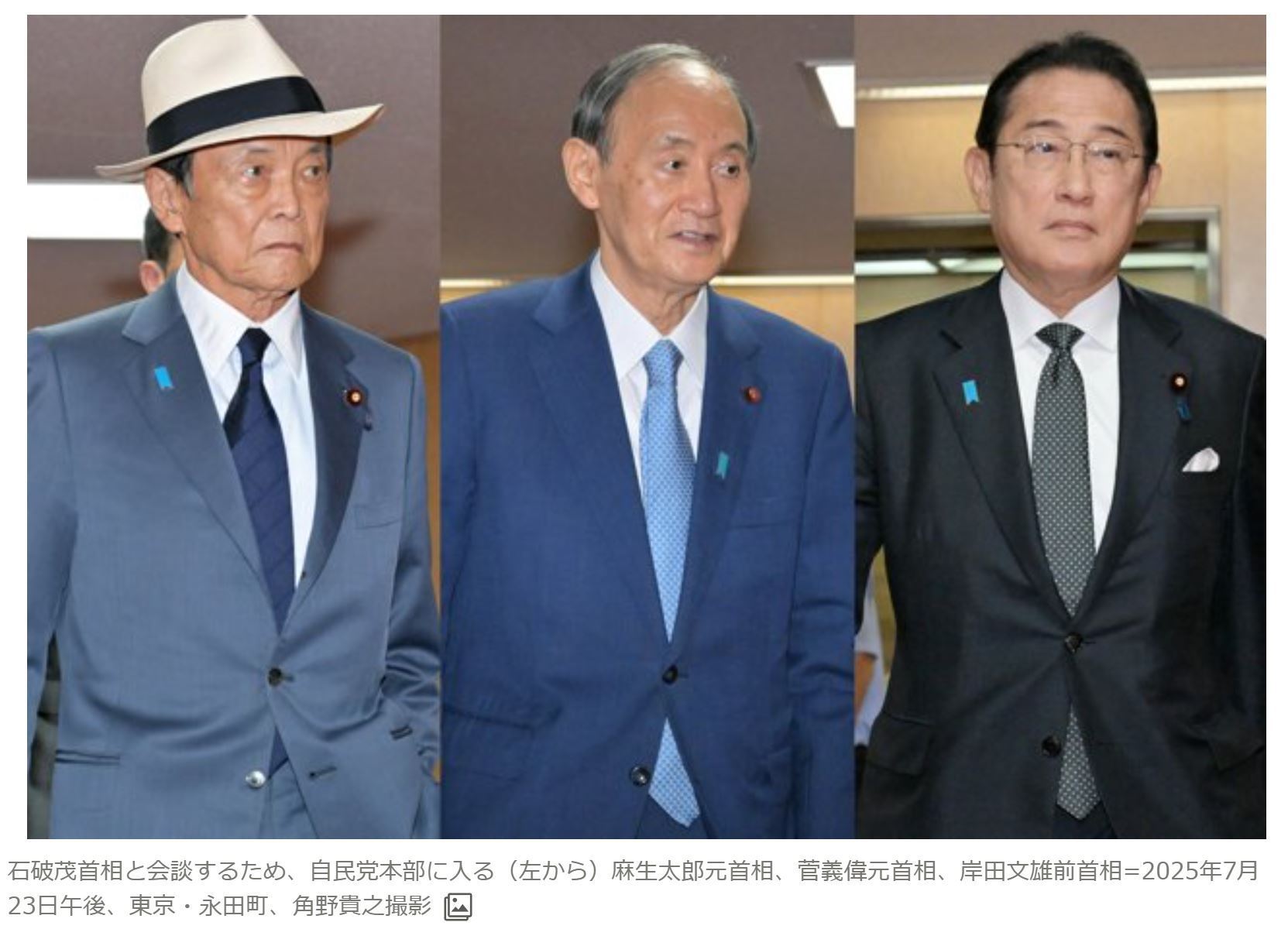 △当地时间2025年7月23日下午,前首相麻生太郎(左)、前首相菅义伟(中)、前首相岸田文雄(右)先后抵达自民党总部。(《朝日新闻》网站报道配图)