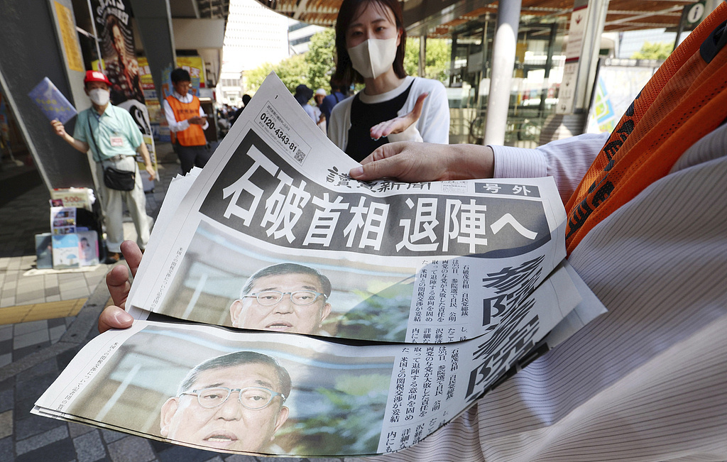 △当地时间2025年7月23日,日本东京街头,《读卖新闻》头版报道首相石破茂决定辞职的消息。(图自视觉中国)