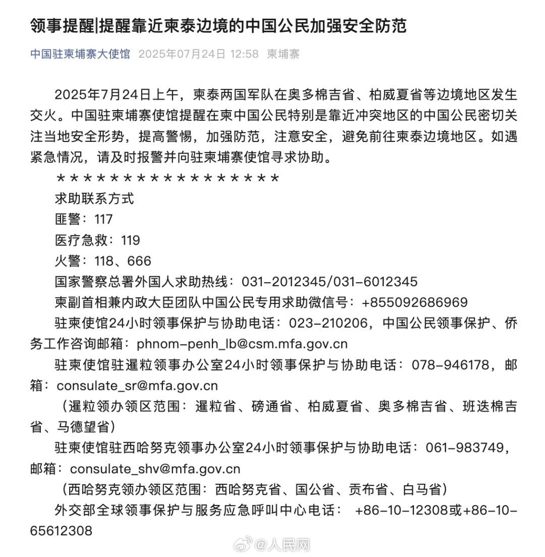 2025年7月24日上午,柬泰两国军队在奥多棉吉省、柏威夏省等边境地区发生交火。中国驻柬埔寨使馆提醒在柬中国公民特别是靠近冲突地区的中国公民密切关注当地安全形势,提高警惕,加强防范,注意安全,避免前往柬泰边境地区。如遇紧急情况,请及时报警并向驻柬埔寨使馆寻求协助。