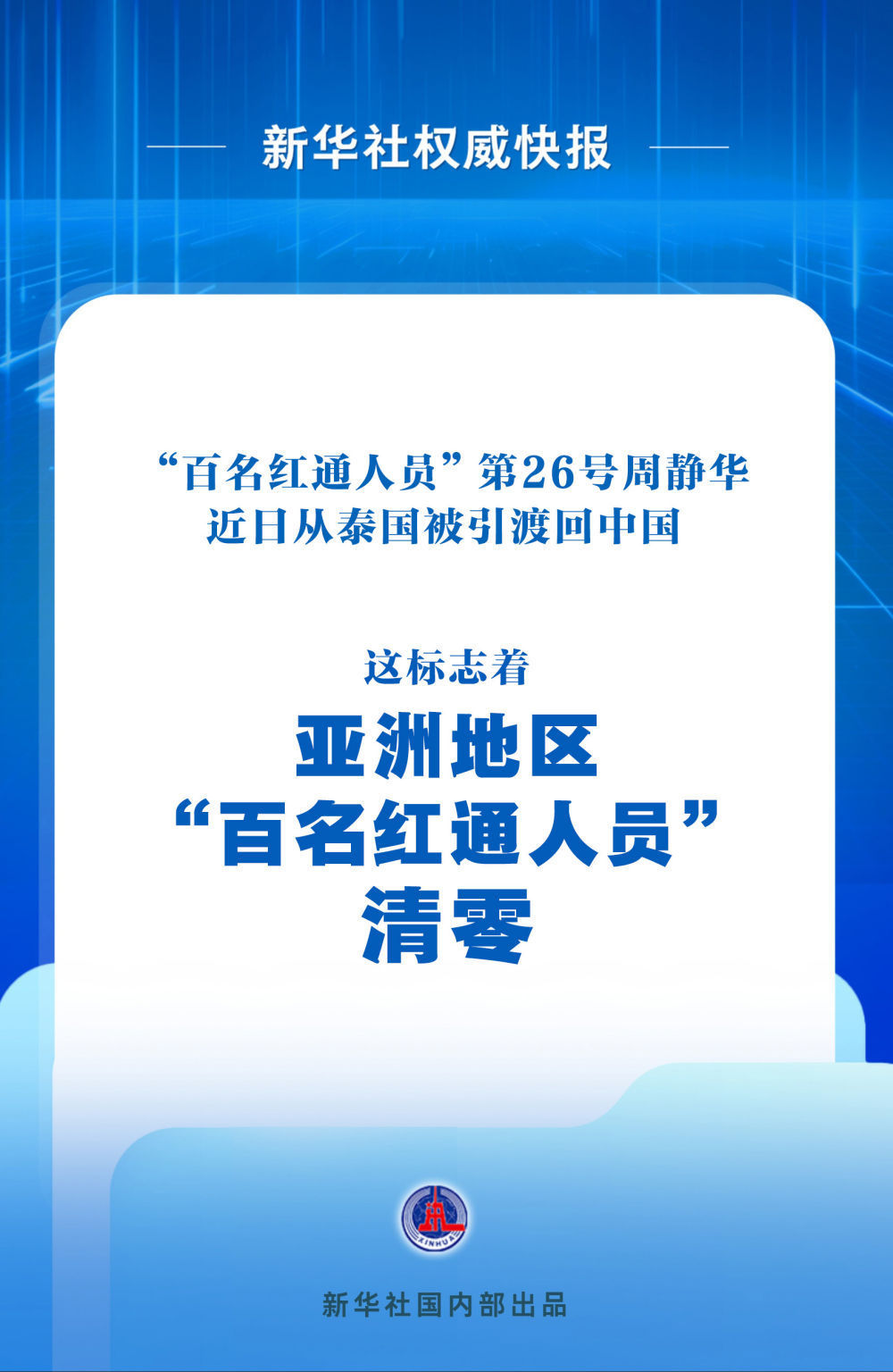 中央追逃办负责人表示,周静华归案标志着亚洲地区“百名红通人员”清零,彰显了我们维护人民利益、捍卫法律尊严的坚定决心和顽强意志。我们将不断加大反腐败国际合作力度,有逃必追、一追到底,尚有一人在逃,就决不收兵。