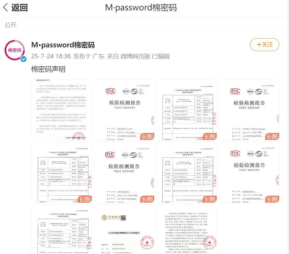7月24日下午,就在刚刚,棉密码微博发布声明并出示了包括抽检报告等在内的一系列材料。棉密码声明称:我司高度重视近期关于棉密码产品的报道信息,第一时间对相关舆论关切问题情况进行了全面核查。现就此事向所有关心棉密码的用户作出说明: