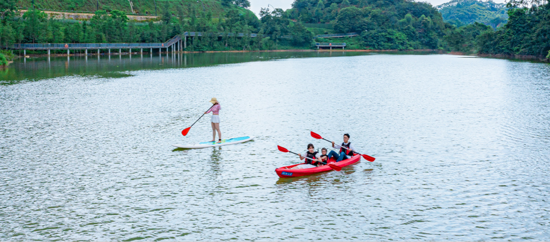 近年来,天人山水开发了系列以“水”为主题的游玩项目。例如,在水上乐园,孩子们可以在沙滩、水池、滑梯等项目中尽情嬉戏;沙溪水库为游客提供体验皮划艇、桨板等水上运动乐趣的机会:乘坐“轻飏1号”水上巴士,可以领略陶渊明笔下“舟遥遥以轻飏,风飘飘而吹衣”的诗意;而在富含负氧离子的清溪谷,游客们能聆听瀑布的轰鸣,享受溯溪戏水之乐。“我们还有一门水生态的课程,让学生体验被污染的水如何变成清水的过程。通过沉淀、过滤等实验,孩子们不仅了解到水资源的宝贵,还培养了环保意识和科学素养。”天人山水工作人员介绍道。