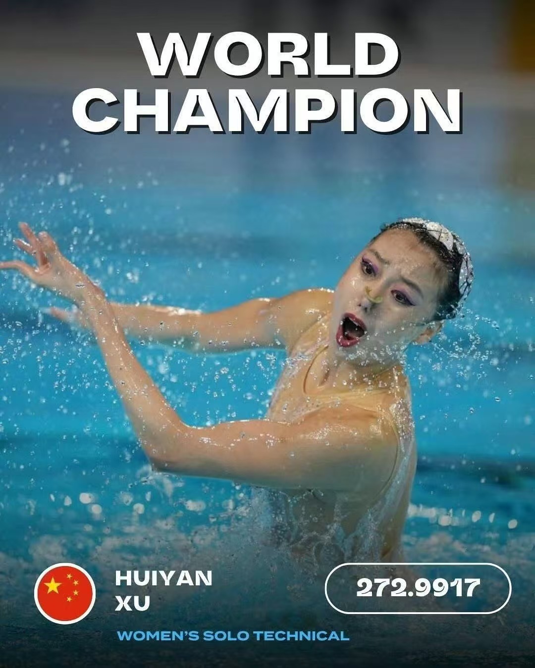 未满20岁的徐汇妍打响头炮,以完美的表现拿下女子单人技术自选的冠军,这是中国队在本届游泳世锦赛上的首金,同时也是中国花样游泳队该项目的世锦赛历史首金。徐汇妍赛后表示:“之前没有敢想的画面,现在出现在我的面前。”随后,徐汇妍不仅随中国队夺得了两个集体项目冠军,还收获了女单自由自选的银牌,在新奥运周期迅速成为中国花游中坚选手的她不仅在动作难度和完成度上有很大进步,艺术表现力方面更是大幅提升,绝对是未来可期。