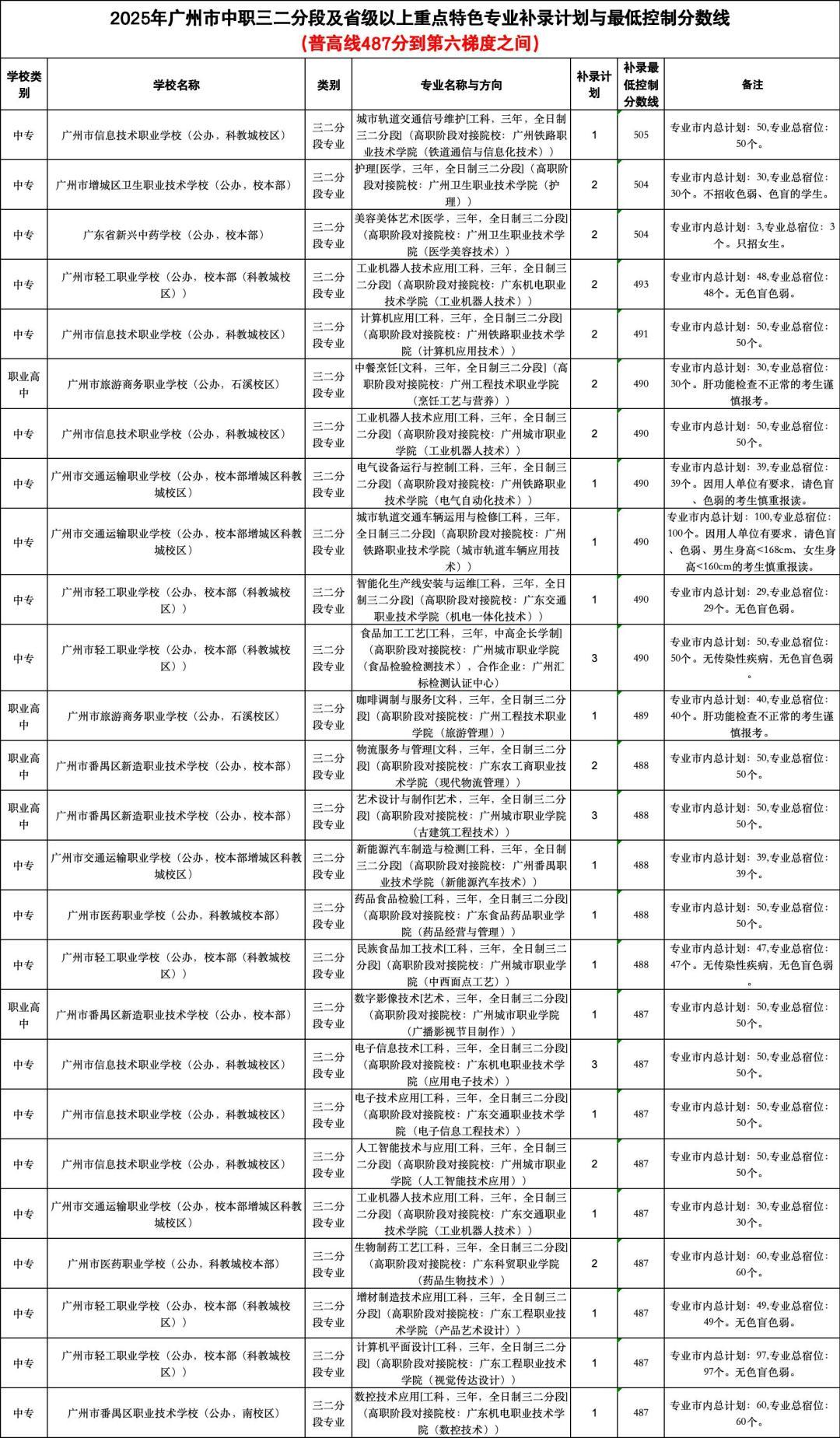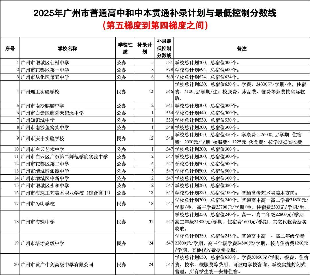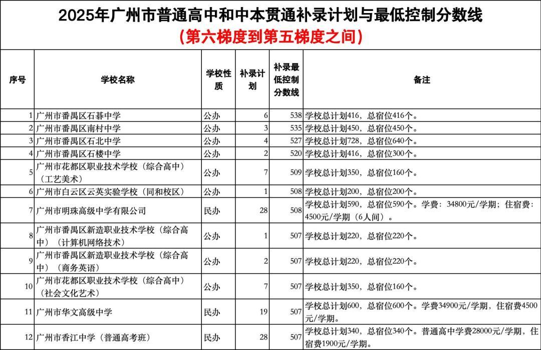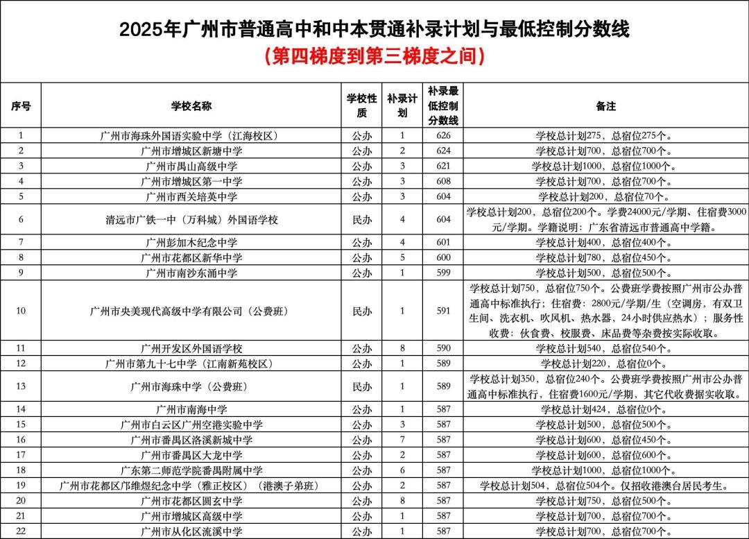 其中剩余补录计划较多的学校有:广州开发区外国语学校,余8个补录计划,补录最低控制分数线为590分;广州市花都区圆玄中学,余8个补录计划,补录最低控制分数线为587分。