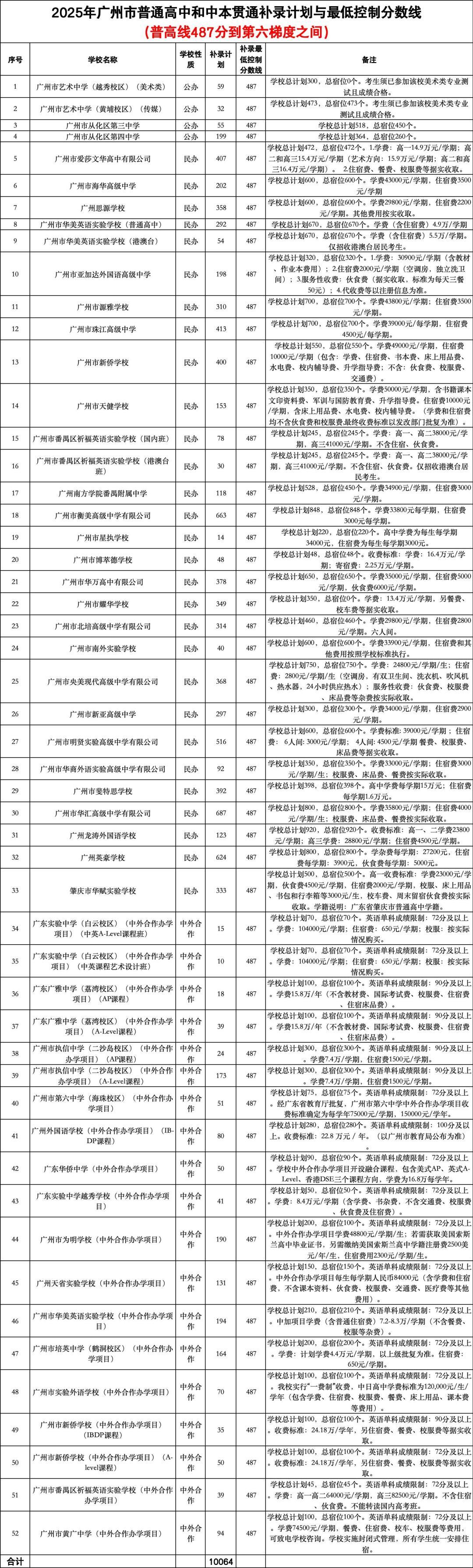 民办普高方面,广州天省实验学校的补录计划有11个,补录最低控制分数线为648分。