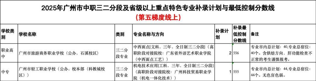 此外,三二分段专业方面,有2所学校的三二分段专业的补录最低控制分数线达到第五梯度线以上,分别为广州市旅游商务职业学校(石溪校区)中西面点专业,余2个补录计划,补录最低控制分数线为556分;广州市轻工职业学校(科教城校区)机电技术应用专业,余1个补录计划,补录最低控制分数线为555分。