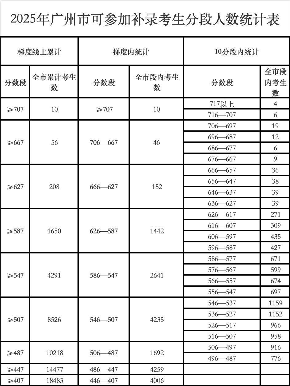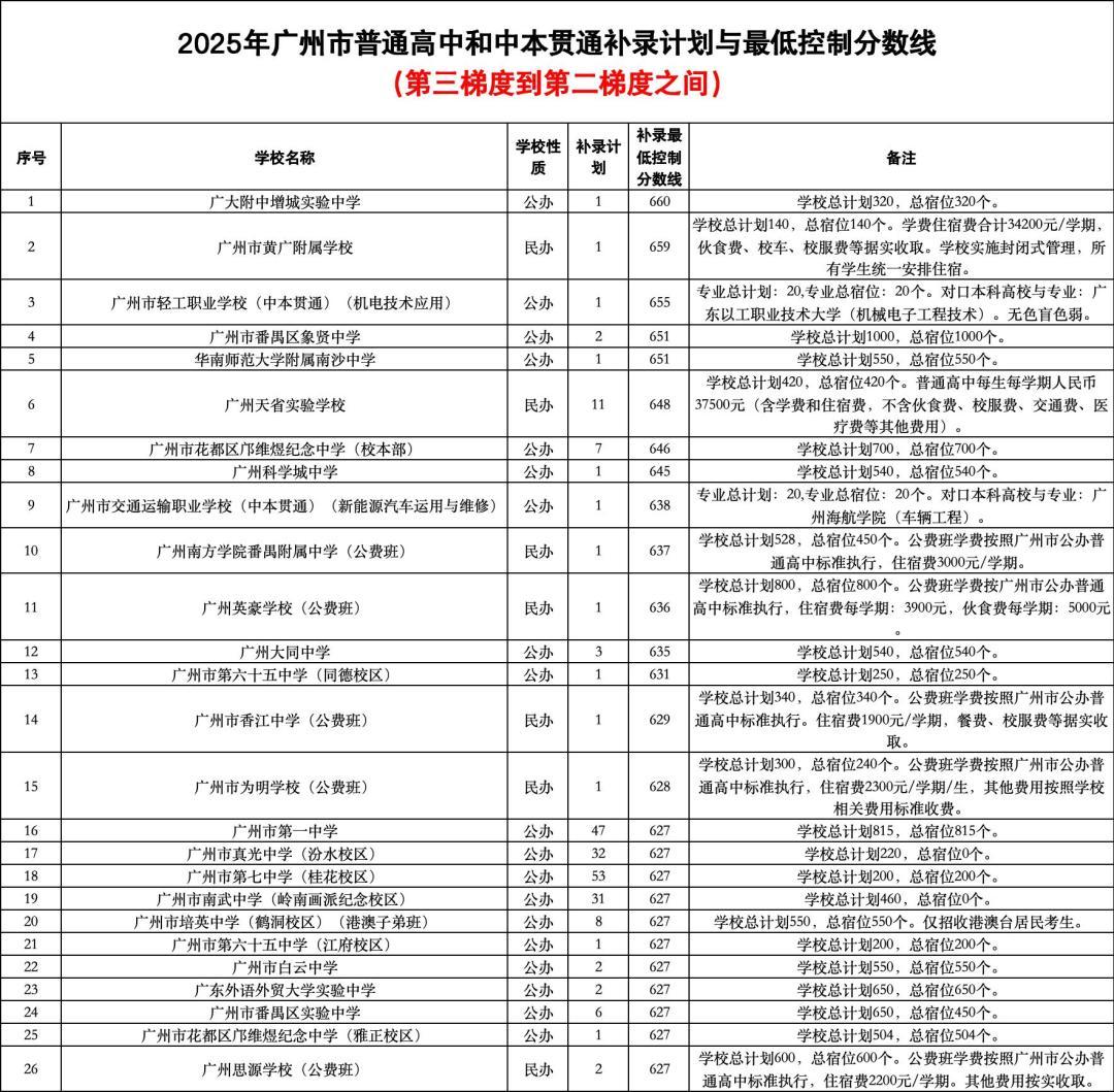 2025年广州市可参加补录考生分段人数统计表显示,分数位于第三梯度线(627分)及以上的补录考生累计有208人。普高方面,补录最低控制分数线位于第三梯度线及以上的学校(含公办普高、民办普高及公费班、中本贯通、中外合作办学项目、港澳子弟班)有36所,共计235个补录计划。